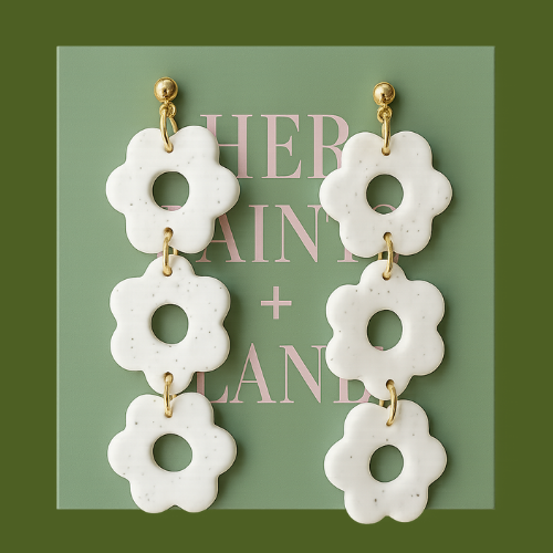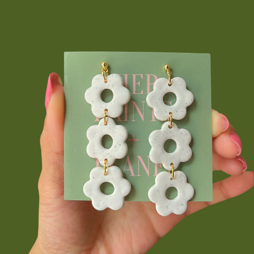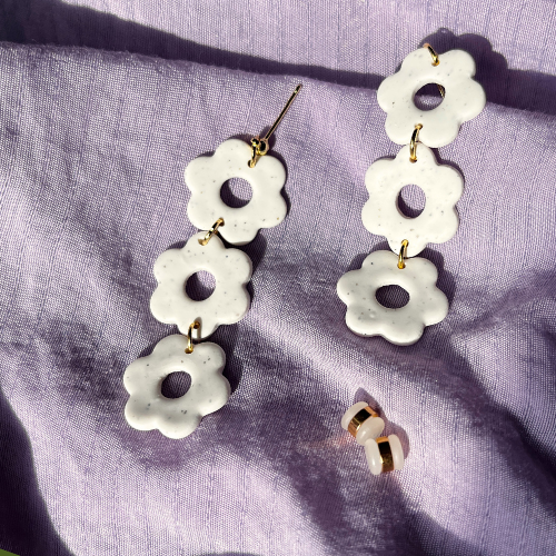 Three stacked flower-shaped charms, handmade from lightweight polymer clay and speckled for a stone-like finish. These playful yet minimal earrings are finished with 14K gold-plated findings and come with soft silicone backings for all-day comfort. Each pair is handmade in small batches—subtle variations make them uniquely yours.