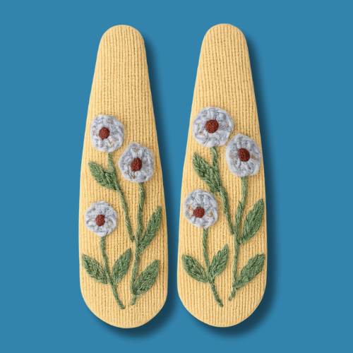 Hand-stitched snap clips with embroidered floral designs. Backed with soft felt padding for a secure hold that won’t tug or pull—gentle on all hair types and comfortable for all-day wear. 🌼