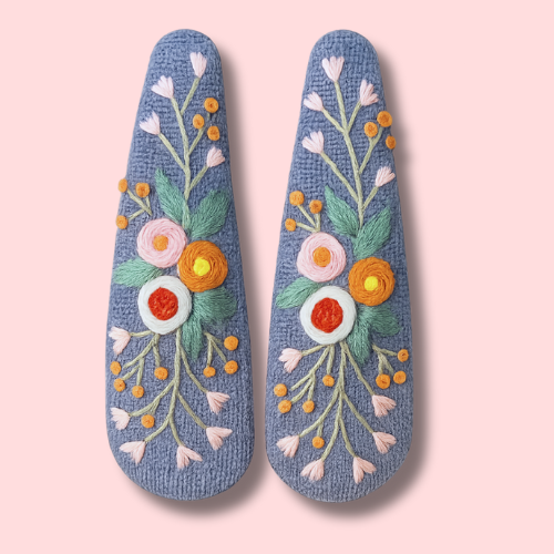Hand-stitched snap clips with embroidered floral designs. Backed with soft felt padding for a secure hold that won’t tug or pull—gentle on all hair types and comfortable for all-day wear. 🌼