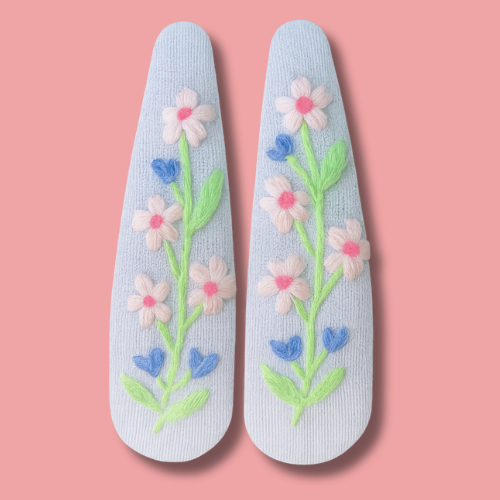 Hand-stitched snap clips with embroidered floral designs. Backed with soft felt padding for a secure hold that won’t tug or pull—gentle on all hair types and comfortable for all-day wear. 🌼