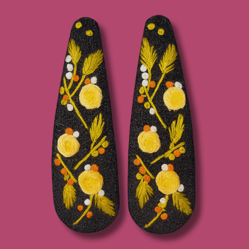 Hand-stitched snap clips with embroidered floral designs. Backed with soft felt padding for a secure hold that won’t tug or pull—gentle on all hair types and comfortable for all-day wear. 🌼