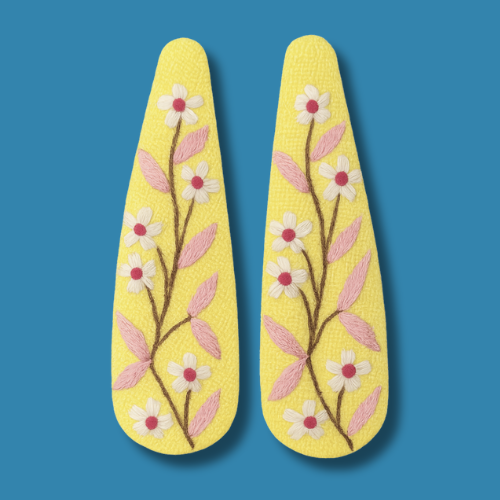 Hand-stitched snap clips with embroidered floral designs. Backed with soft felt padding for a secure hold that won’t tug or pull—gentle on all hair types and comfortable for all-day wear. 🌼