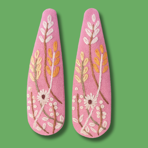 Hand-stitched snap clips with embroidered floral designs. Backed with soft felt padding for a secure hold that won’t tug or pull—gentle on all hair types and comfortable for all-day wear. 🌼