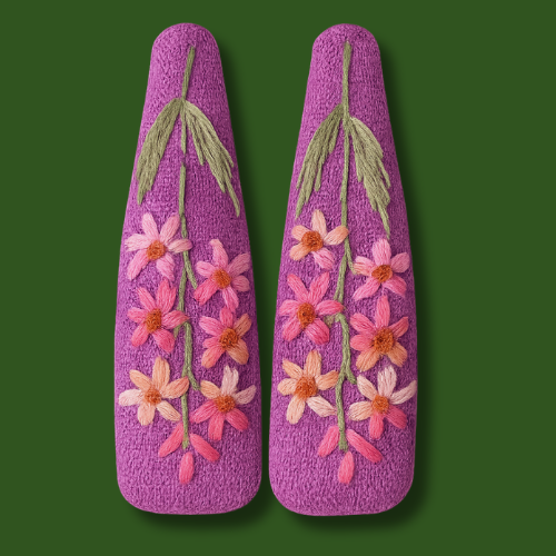 Hand-stitched snap clips with embroidered floral designs. Backed with soft felt padding for a secure hold that won’t tug or pull—gentle on all hair types and comfortable for all-day wear. 🌼