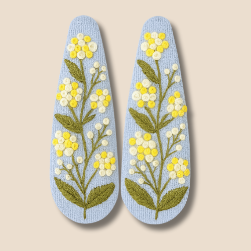 Hand-stitched snap clips with embroidered floral designs. Backed with soft felt padding for a secure hold that won’t tug or pull—gentle on all hair types and comfortable for all-day wear. 🌼