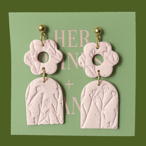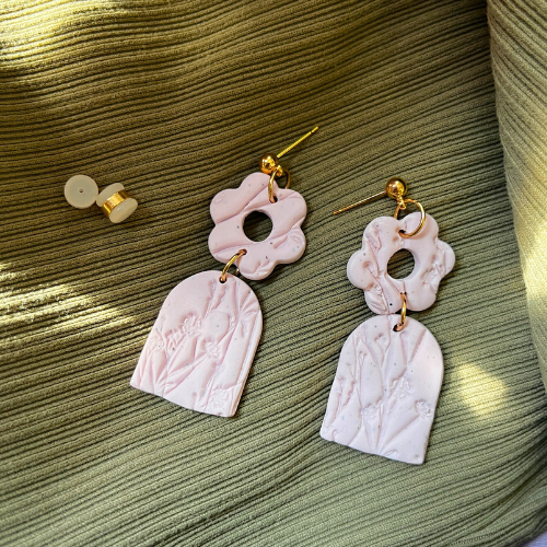 Blush pink floral tops meet softly arched botanical panels in this elegant, nature-inspired pair. Each earring is handmade from polymer clay, featuring delicate wildflower impressions and subtle speckling. Finished with 14K gold-plated findings and soft silicone backings for comfortable wear. Each pair is handmade in small batches—subtle variations make them uniquely yours.